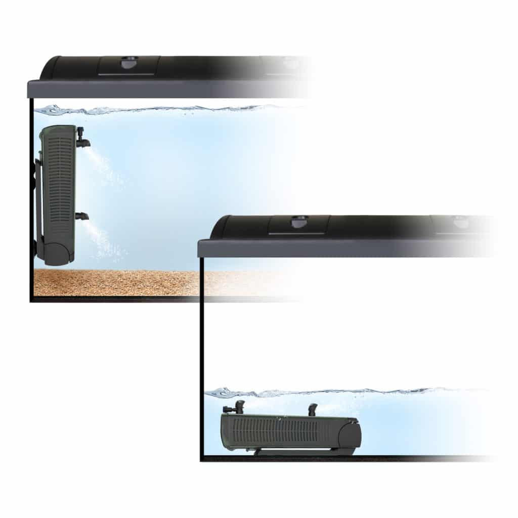 - Placera vertikalt mot akvariets vägg för att skapa strömmar eller anpassade flödesmönster