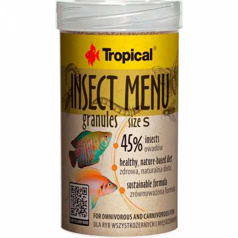 Multiingrediensfoder i form av flingor baserat på 3 insekter: hermetia (15%), silkesmask (15%) och mjölmask (15%) för allätande och köttätande fiskar.