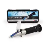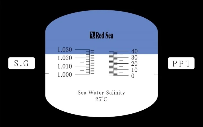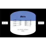 Saltmätare-refraktometer med mycket hög precision, framtagen specifikt för havsvatten. Förkalibrerad på 25 grader, automatisk temp. kompensation, högupplöst display för tydlig avläsning av absoluta salthalten i ( PPT och S.G.).