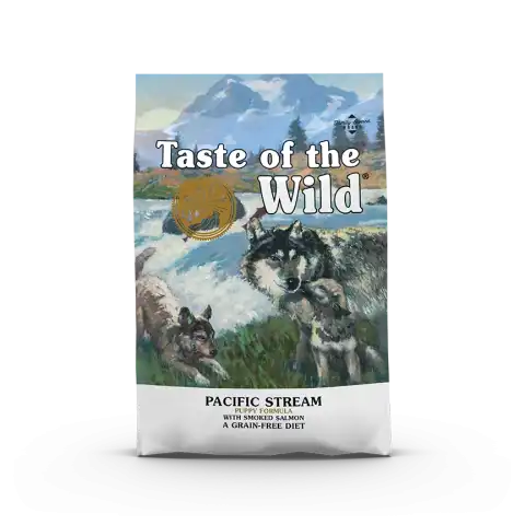 Taste of the wild Pacific Stream Puppy innehåller 27% råproteiner och 15% fett.